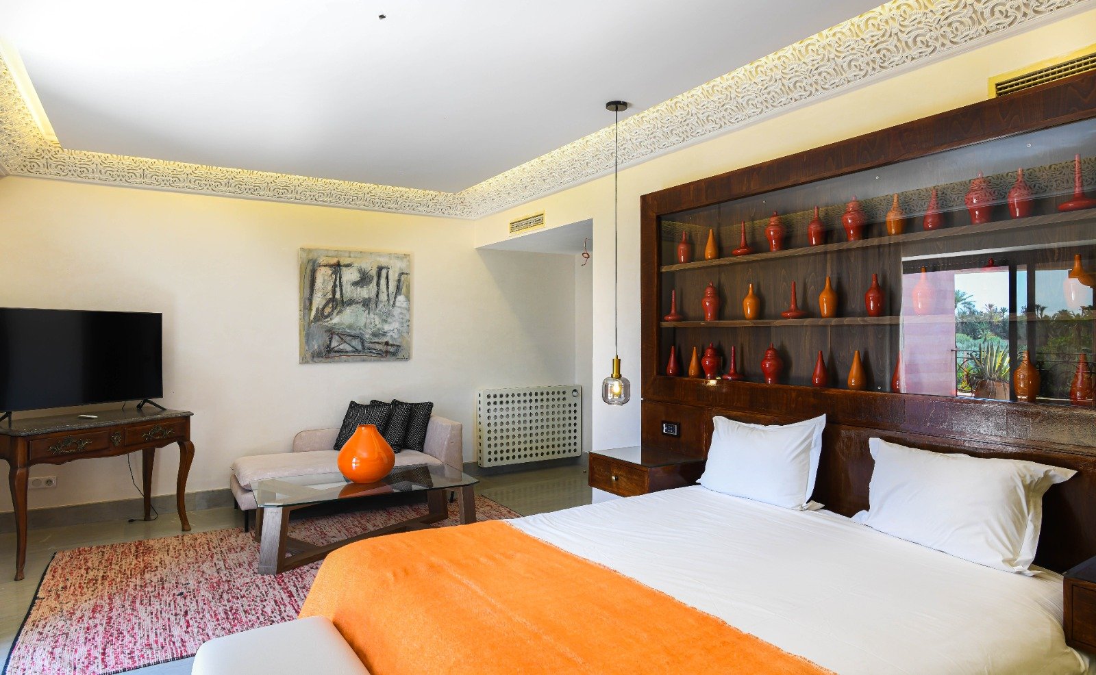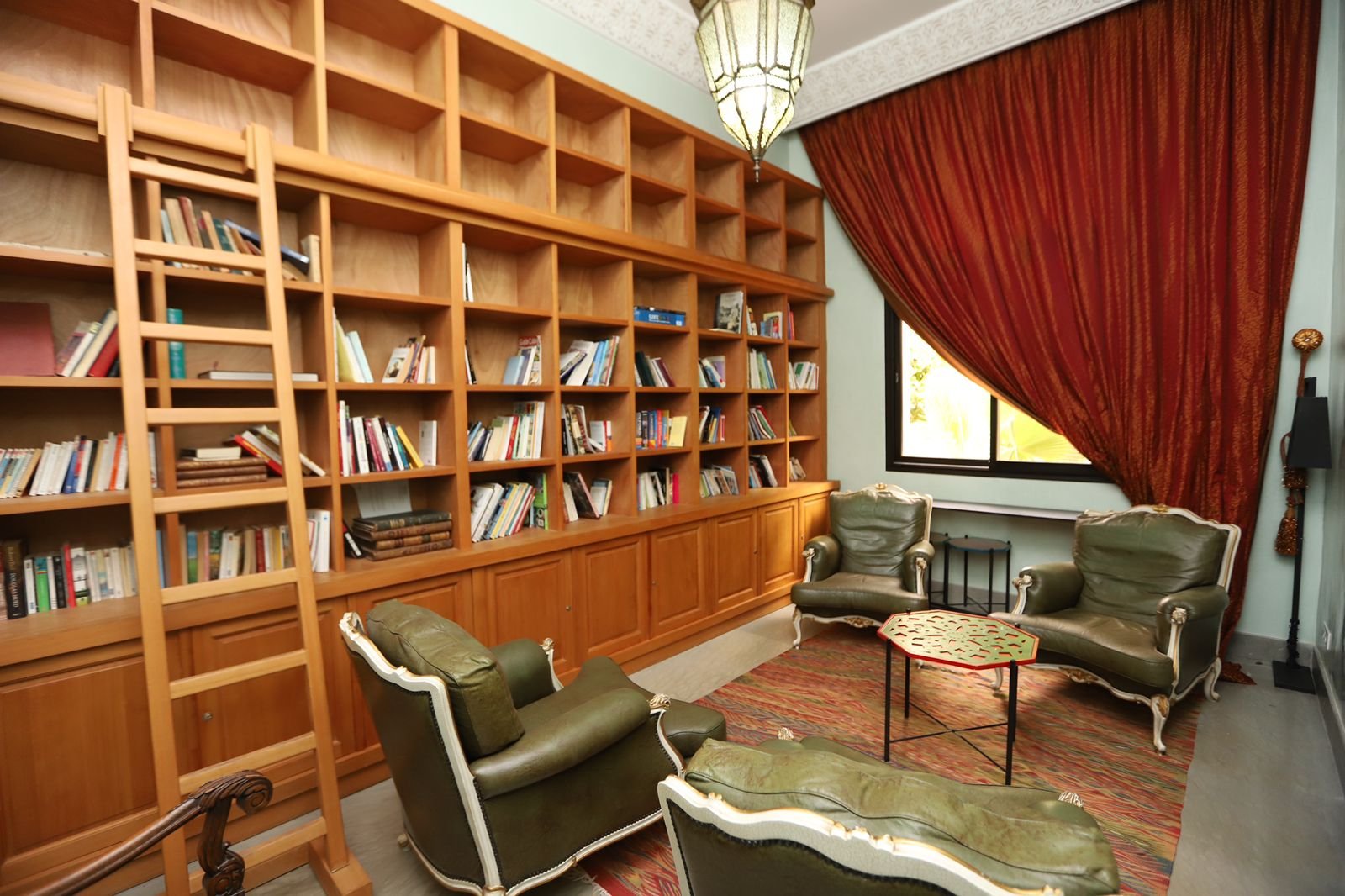 The spacious Moroccan living room, adorned with carved woodwork and sumptuous fabrics, invites relaxation and conviviality.
